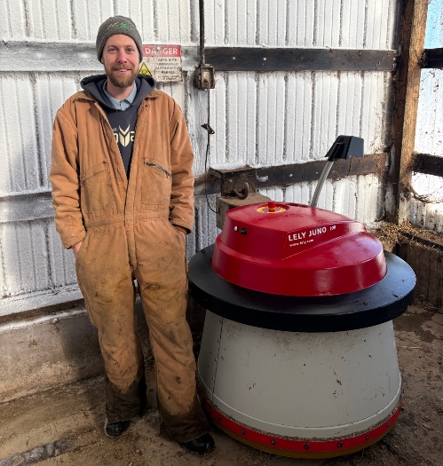 Brandon worked off the farm and helped his dad before the family upgraded. When he returned to the farm full time, they built a 3-row barn with two Lely A5 robots, a Juno feed pusher and a manure Collector. They doubled their herd to fill the barn.